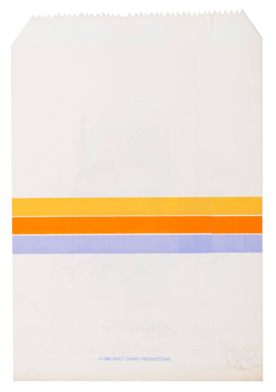 (EPCOT Center, 1980s) An early paper bag from EPCOT Center merchandise locations. Measuring 5.5" x 8" the bag is in very good condition with light discoloration and a folded edge on the reverse.
