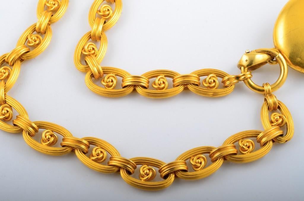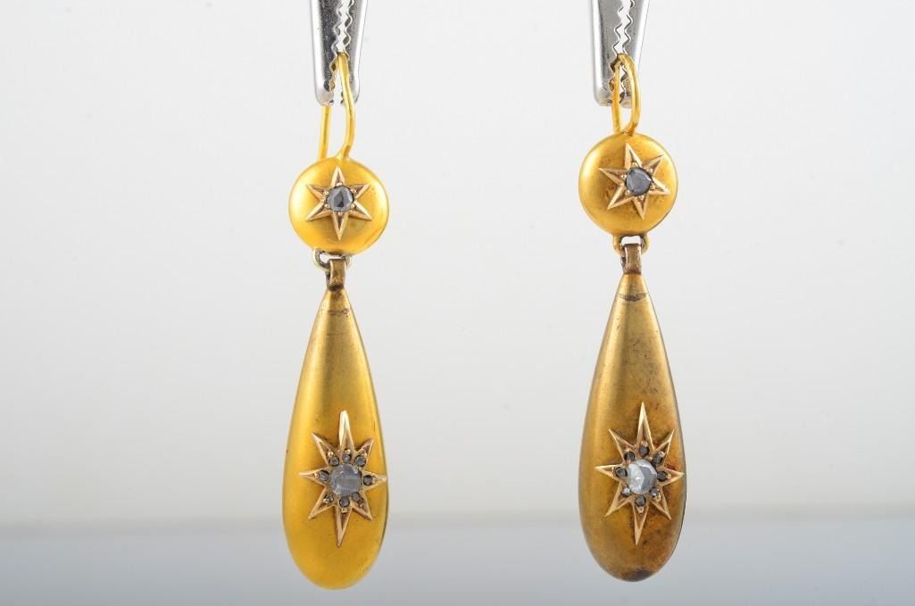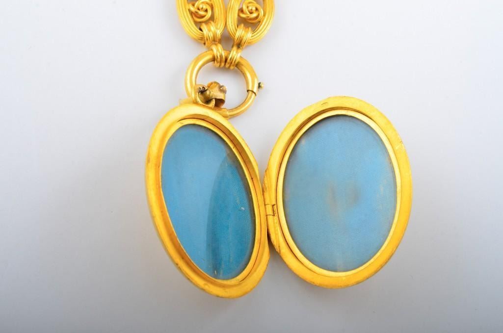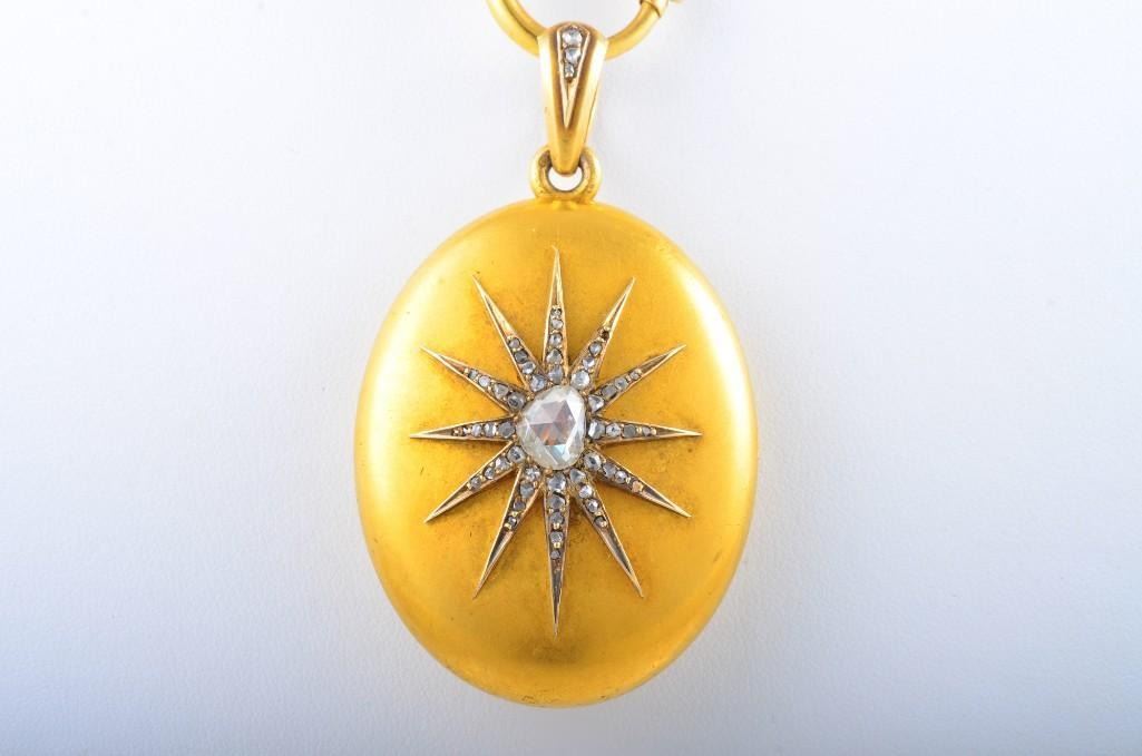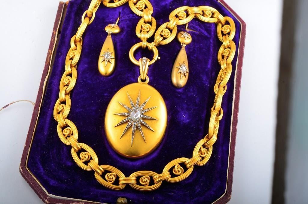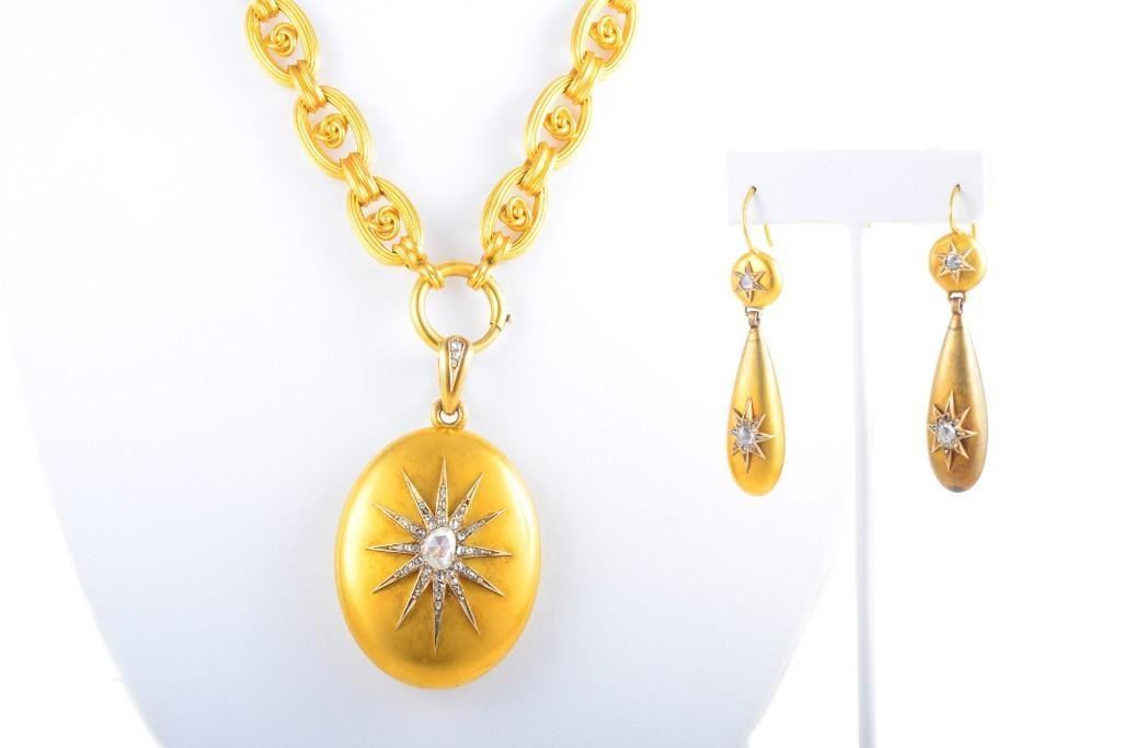Early Georgian locket necklace and earrings suite in 19K yellow gold and diamonds. Locket attaches to lobster clasp and contains two facing sides for photos, currently empty. The front of the locket is set with a central rose cut oval diamond weighing approximately 1 carat and radiating diamonds. Necklace length 18 inches excluding locket. Locket measures 2 x 1 1/2 inch. Earrings are hook back, also set with diamonds. Length approximately 2 inches. Chain and earrings are hollow-formed, very lightweight. Total weight 86.7g.