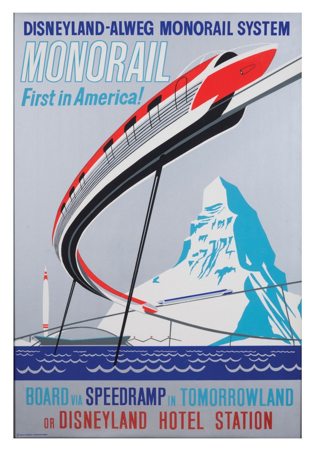(Disneyland, 1961) An original hand-silkscreened poster for the Disneyland-Alweg Monorail. Designed by Paul Hartley, this early version of the shimmering metallic-grey poster depicts Tomorrowland's Rocket to the Moon attraction in the background. Measuring 36"x54" the poster is in very good condition with few mild scuffs and little wear.