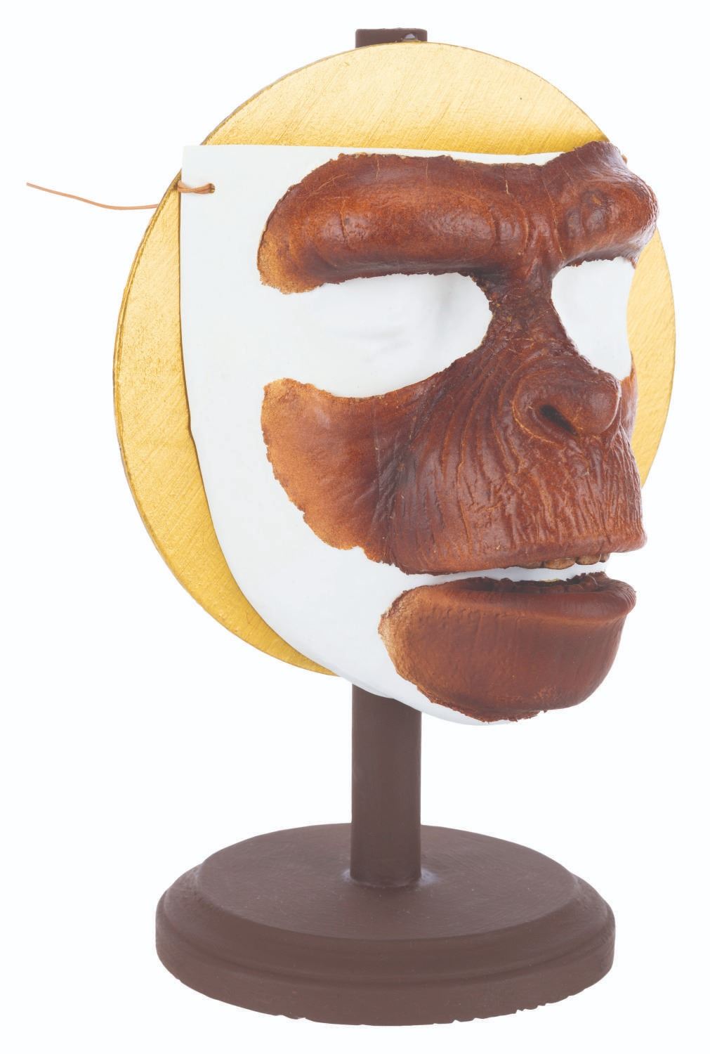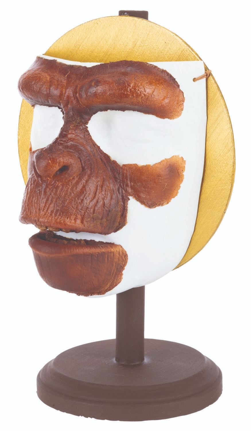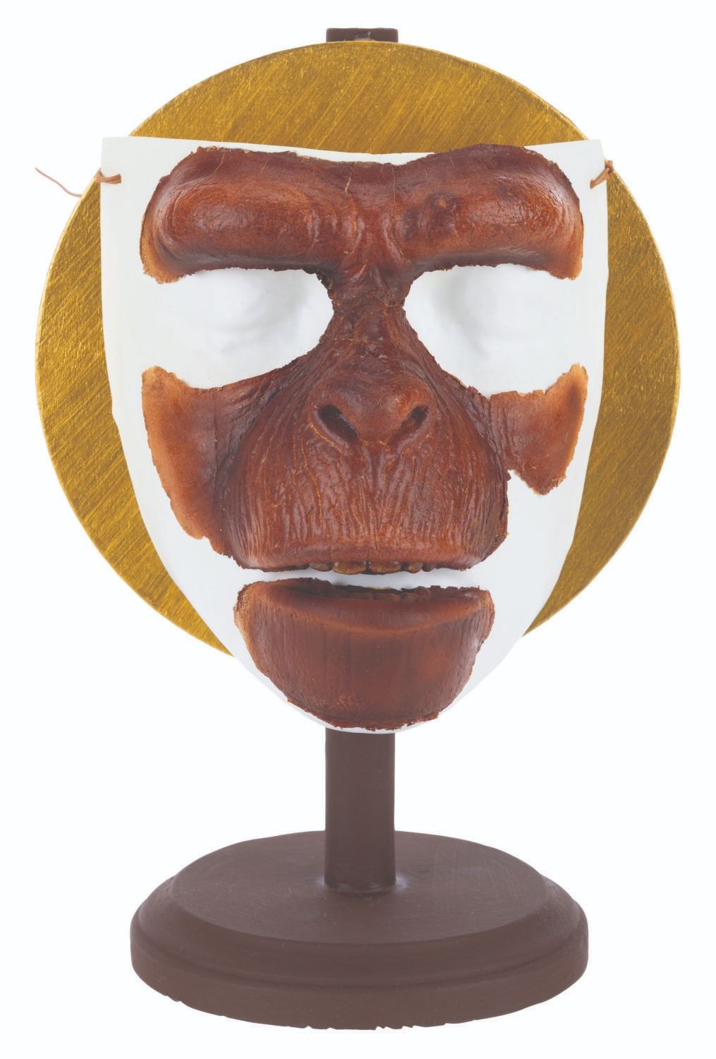 (20th Century Fox, 1973) An incredible chimp makeup facial appliance from “Battle for the Planet of the Apes.” When the first “Planet of the Apes” film debuted in 1968, the pioneering effects by make-up artists John Chambers and Thomas Burman revolutionized science fiction cinema, allowing Oscar-winning actors Roddy McDowall and Kim Hunter to portray non-human characters with depth and emotion never before seen. Those techniques were refined throughout the original Planet of the Apes series. This facial appliance for a chimp child measures 6” x 5” high, preserved on a vacuform face with a custom 6.75” diameter x 10” high display. The appliance is in remarkably very good condition for its age, with very faint fraying and hairline cracking visible around the edges of this iconic piece.