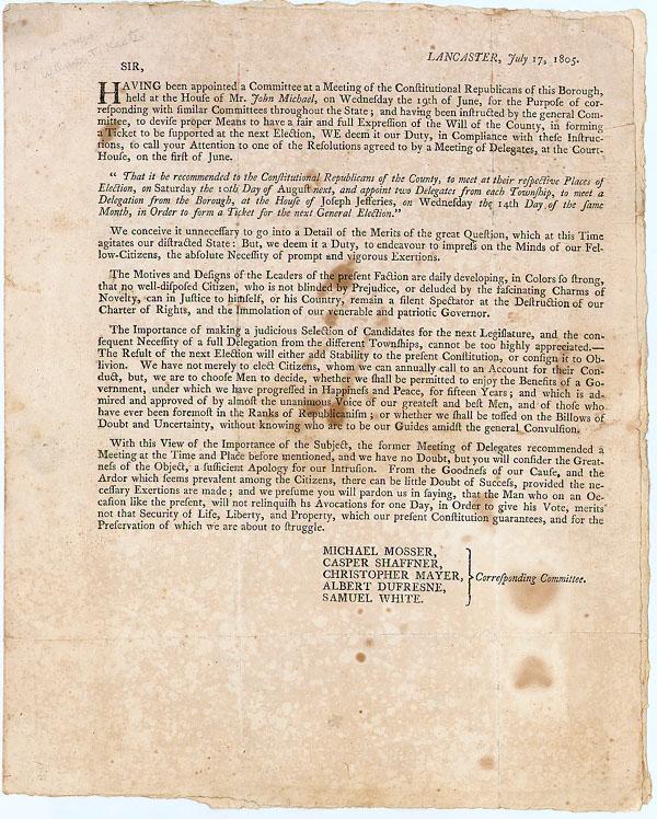 9” x 11”. Lancaster, Pennsylvania. July 17, 1805. Printed circular in which the Republican Corresponding Committee presses the need for viable republican candidates in the upcoming election which they considered to be “the absolute Necessity of prompt and vigorous Exertions…” The appeal continues on, “The Motives and Designs of the Leaders of the present Faction are daily developing, in Colors so storng that no well-disposed Citizen, who is not blinded by Predjudice, or deluded by the fascinating Charms of Novelty, can in Justice to himself, or his Country, remain a silent Spectator, at the Destruction of our Charter of Rights, and the Immolation of our venerable and patriotic Governor…” “The Result of the next Election will either add Stability to the present Constitution, or consign it to Oblivion…” Thomas McKean, who had been elected Governor of Pennsylvania in 1799, would win the upcoming election, ensuring the current party would stay in power. The national political climate was particularly difficult at this period and this document exhibits the efforts put forth at the local levels to support the national agenda. A fine political item. Some light age spots at center, otherwise fine.