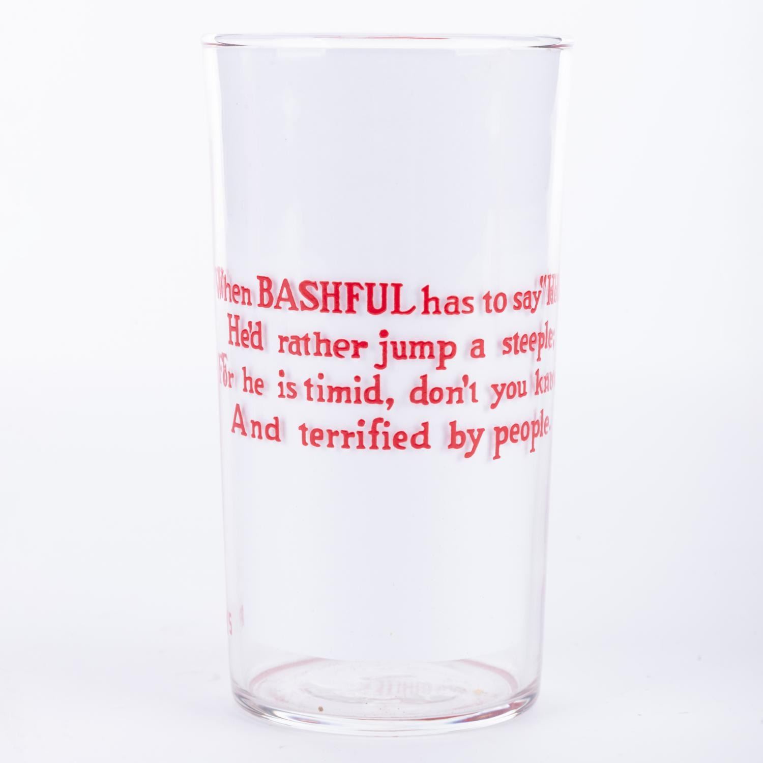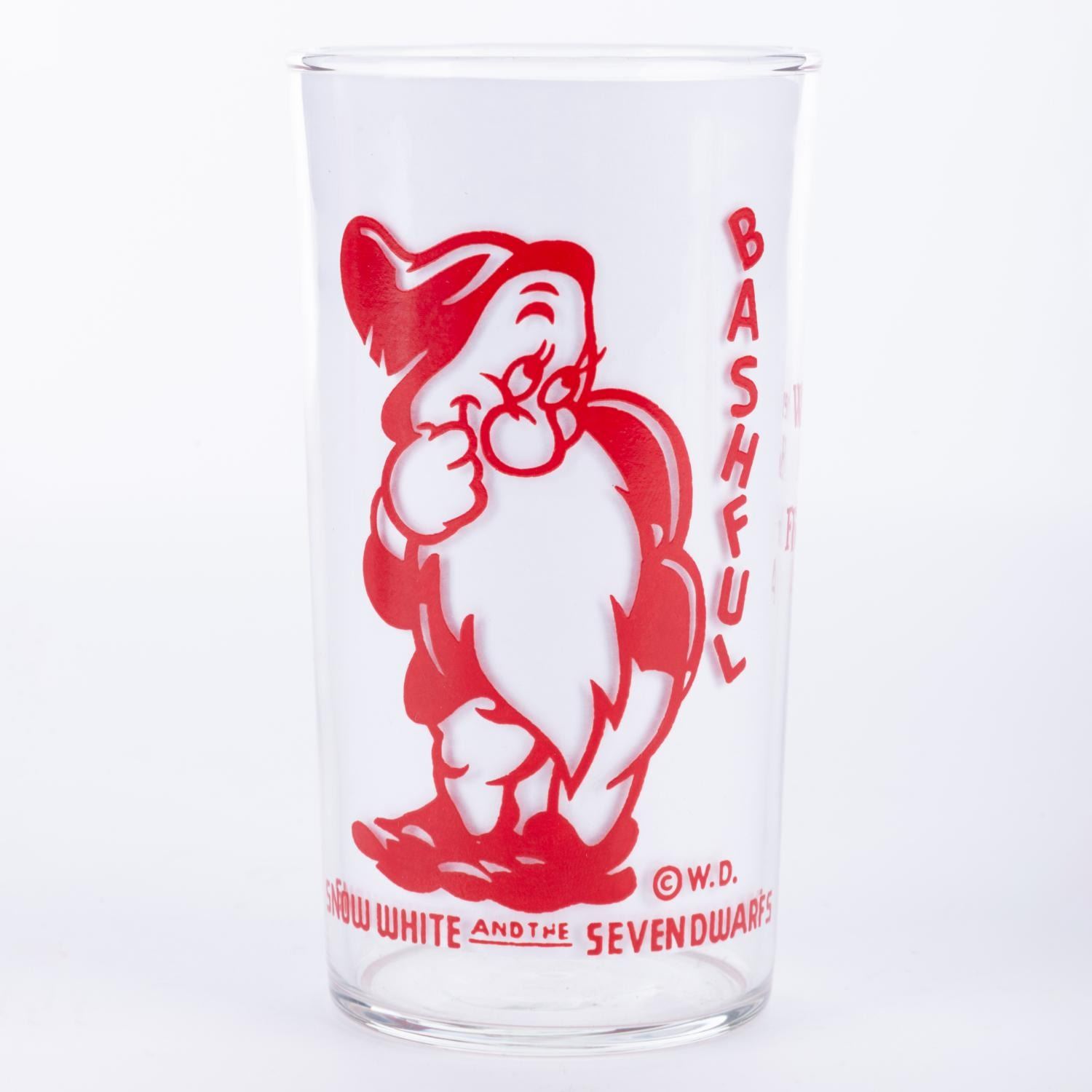 (Libbey/Owens, 1938) A "Snow White and the Seven Dwarfs” souvenir drinking glass featuring Bashful, produced by both the Libbey Glass Company and Owens-Illinois Glass Company of Toledo, Ohio. Measuring 2.5” in diameter and 4.75” tall, the glass is in very good condition with very minor handling wear.