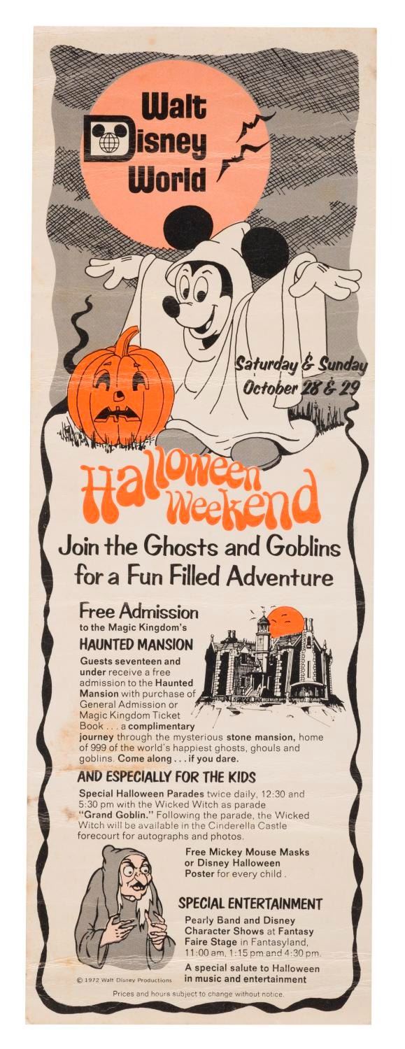 (Walt Disney World, 1972) A handbill for Halloween Weekend at Walt Disney World in 1972, including a free admission to the Haunted Mansion for Guests under 18 and information on the parades and special entertainment. Measuring 4" x 11", the handbill is in good condition with crease lines throughout from being rolled, and spotting.