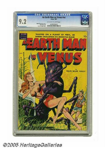 <B>An Earth Man on Venus #nn (Avon, 1951) CGC NM- 9.2 Off-white to white pages.</B></I> This science fiction one-shot boasts interior art by Wally Wood and a cover by Gene Fawcette. The issue is a Gerber "7". Overstreet 2005 NM- 9.2 value = $1,700. CGC census 3/05: 2 in 9.2, none higher.