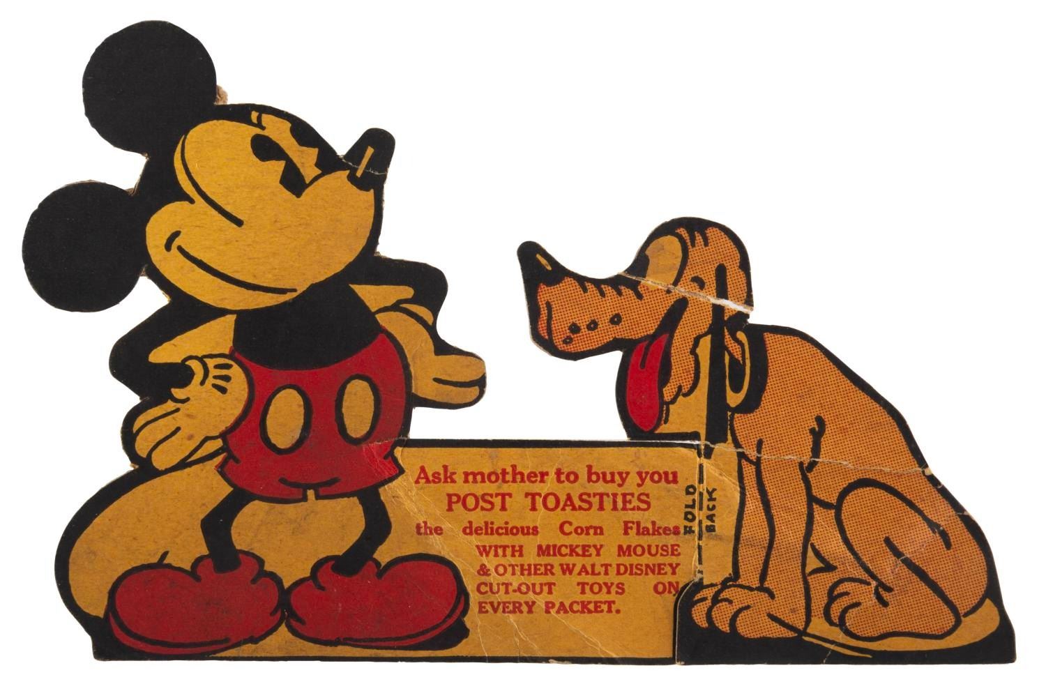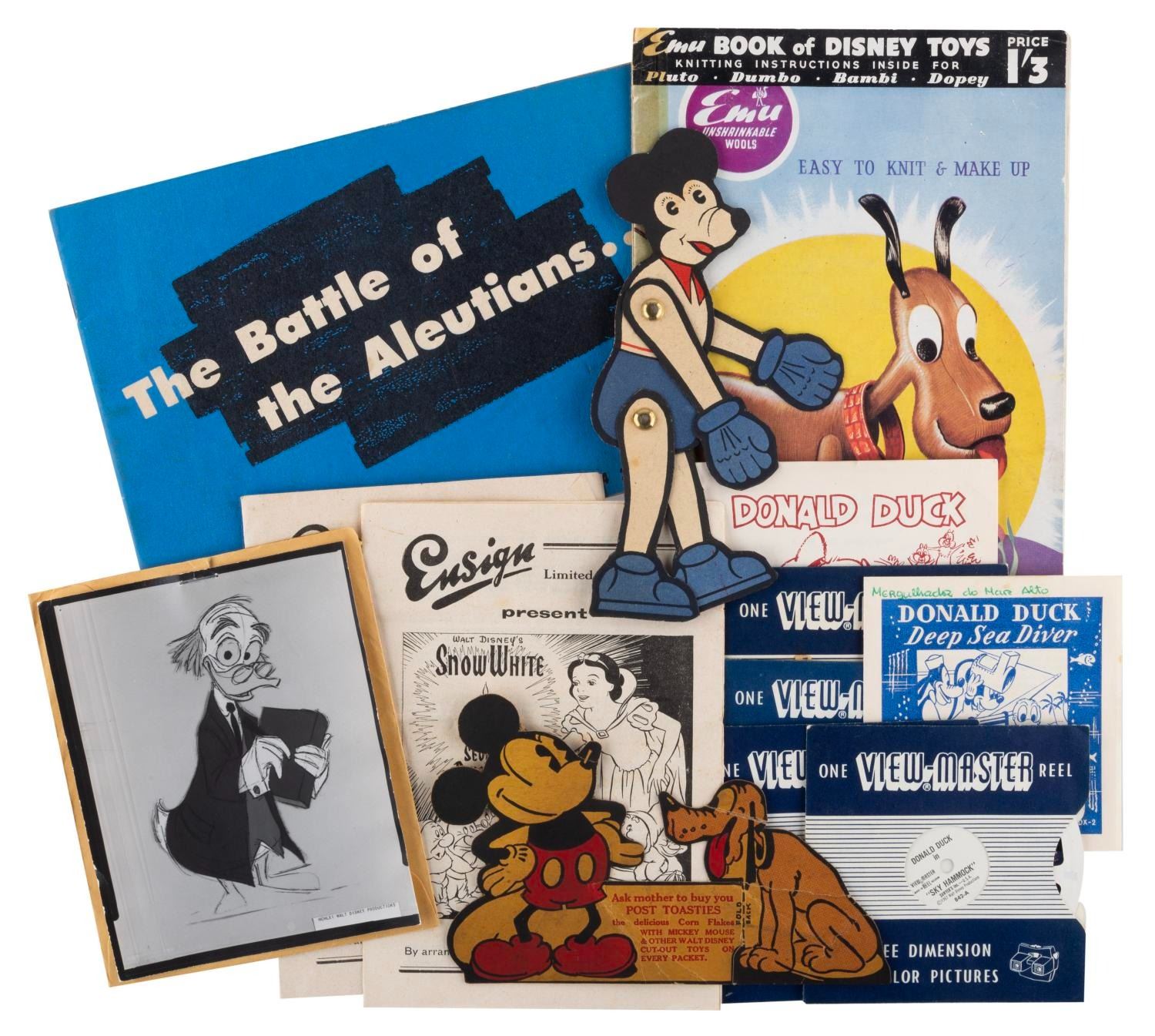 (Disney, 1930s-60s) An eclectic collection of Disney items through the years including a 1930s Mickey and Pluto Post Toasties cut out, an early Mickey paper figure, a pair of Snow White slide show story booklets, an Emu book of Disney toys with instructions for knitting Disney characters, three Donald Duck & Chip N’ Dale viewmaster reels with booklet, a “Battle of the Aleutians” booklet, and a Studio negative of Ludwig von Drake with two contact prints. The items are in good to very good condition with the Emu book cover loose with tape along the spine.