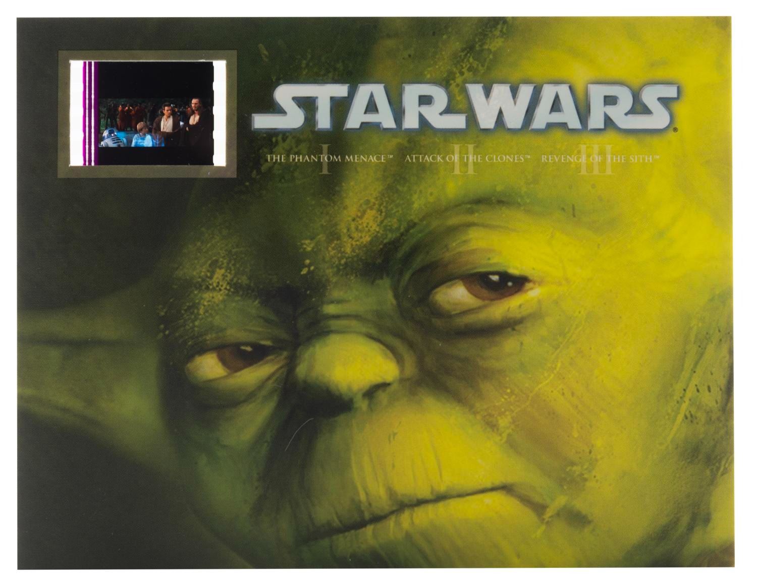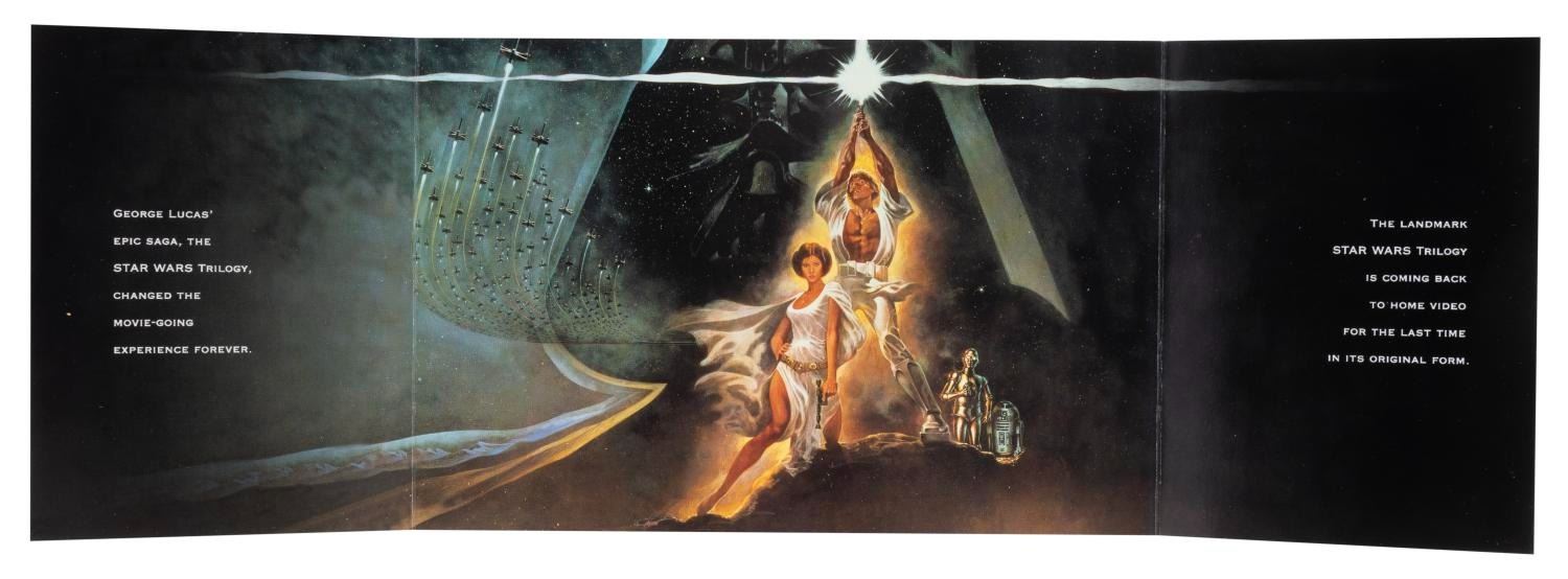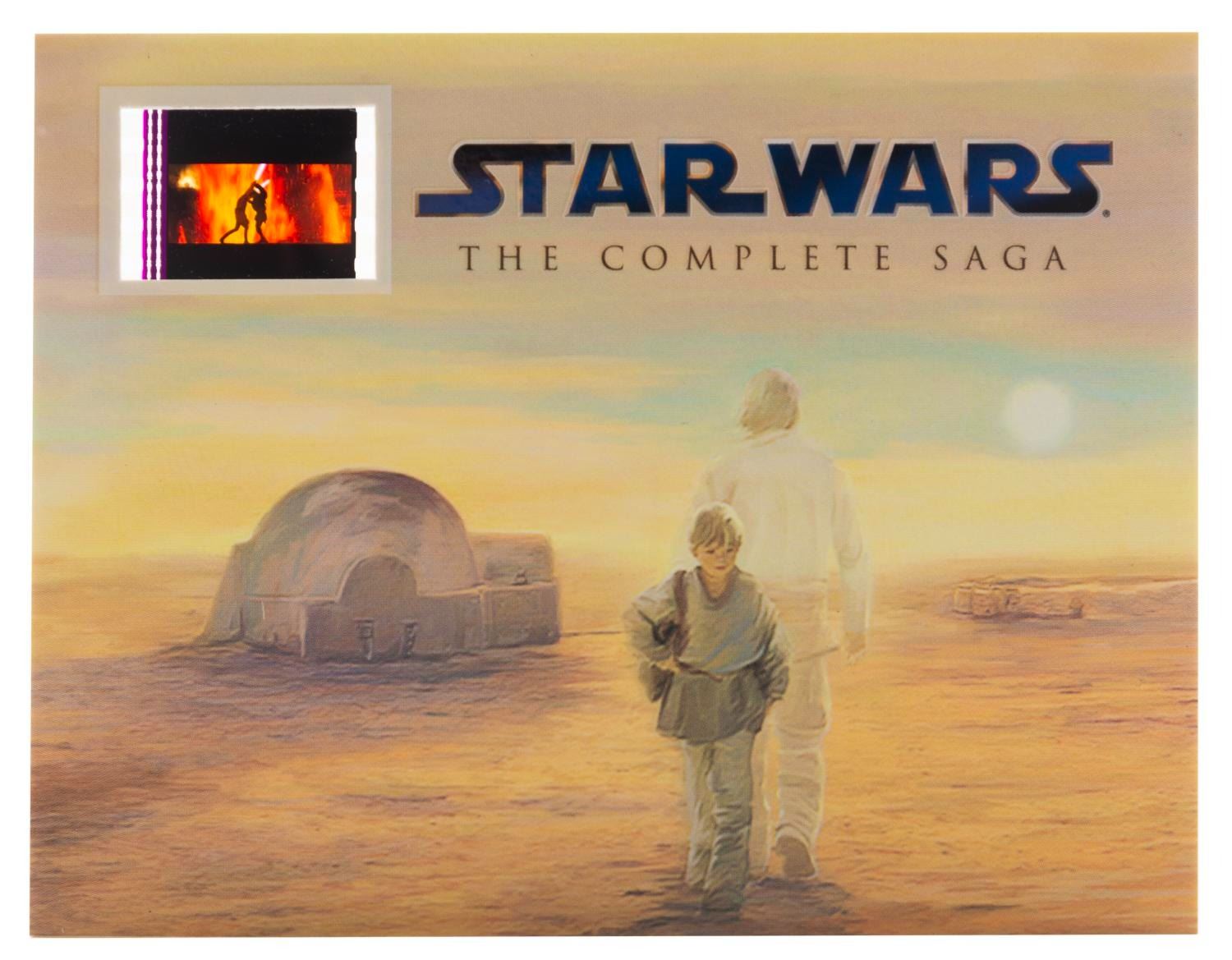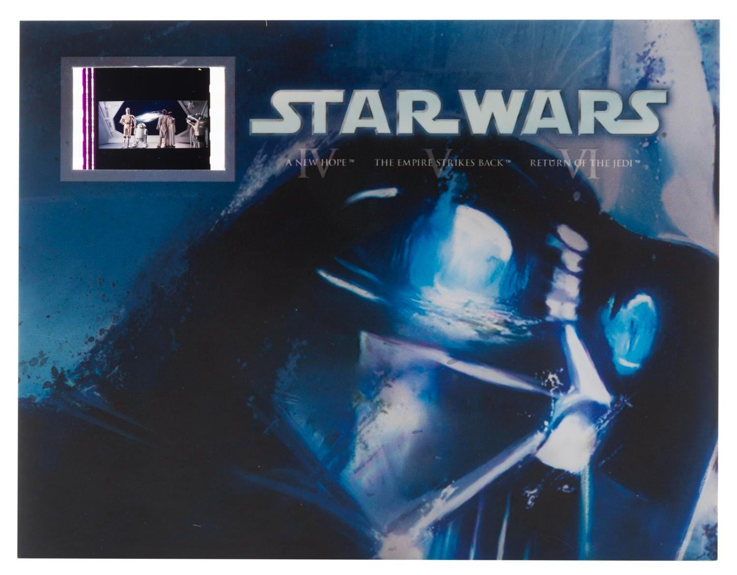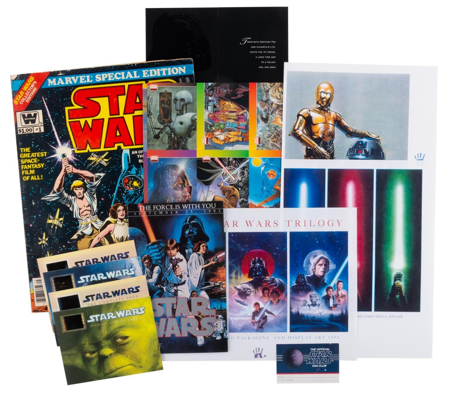 (Lucasfilm, 1977-2000s) A collection of Star Wars collectibles related to the first six films in the series. Included are the Marvel Special Edition oversized adaptation of the film issue 1, a fan club card, a flyer for the film’s pay-per-view debut in 1982, four color printouts of 1987 video release designs, seven uncut sheets of two sets of 9 Star Wars Galaxy trading cards from 1993, a 1995 video release announcement, and four senitypes each presenting one 35mm frame of the films. The collectibles are in good to very good condition, with some typical handling wear and discoloration from age to the comic.