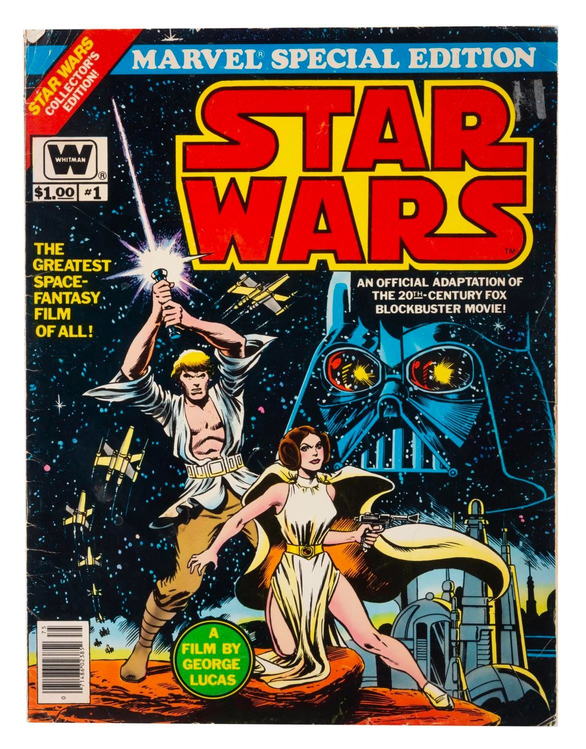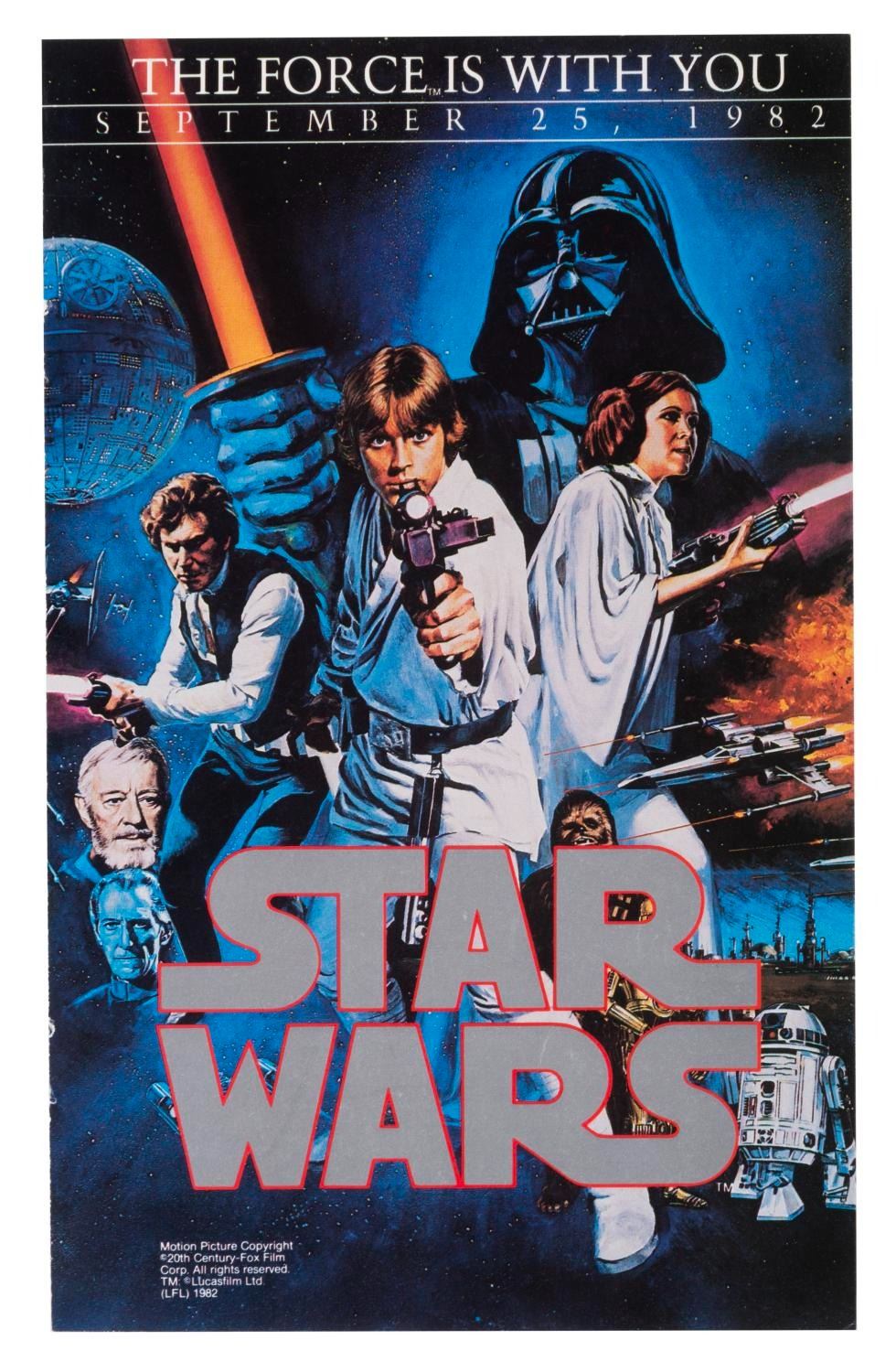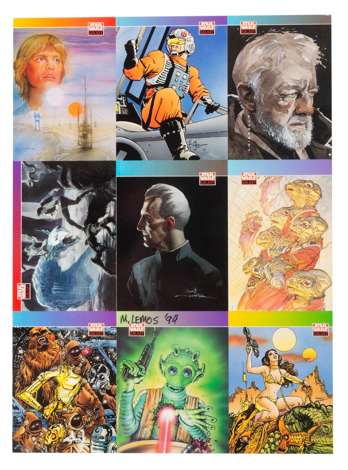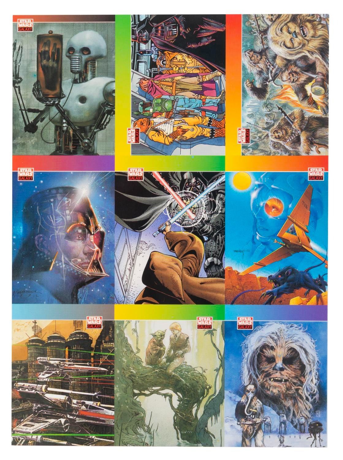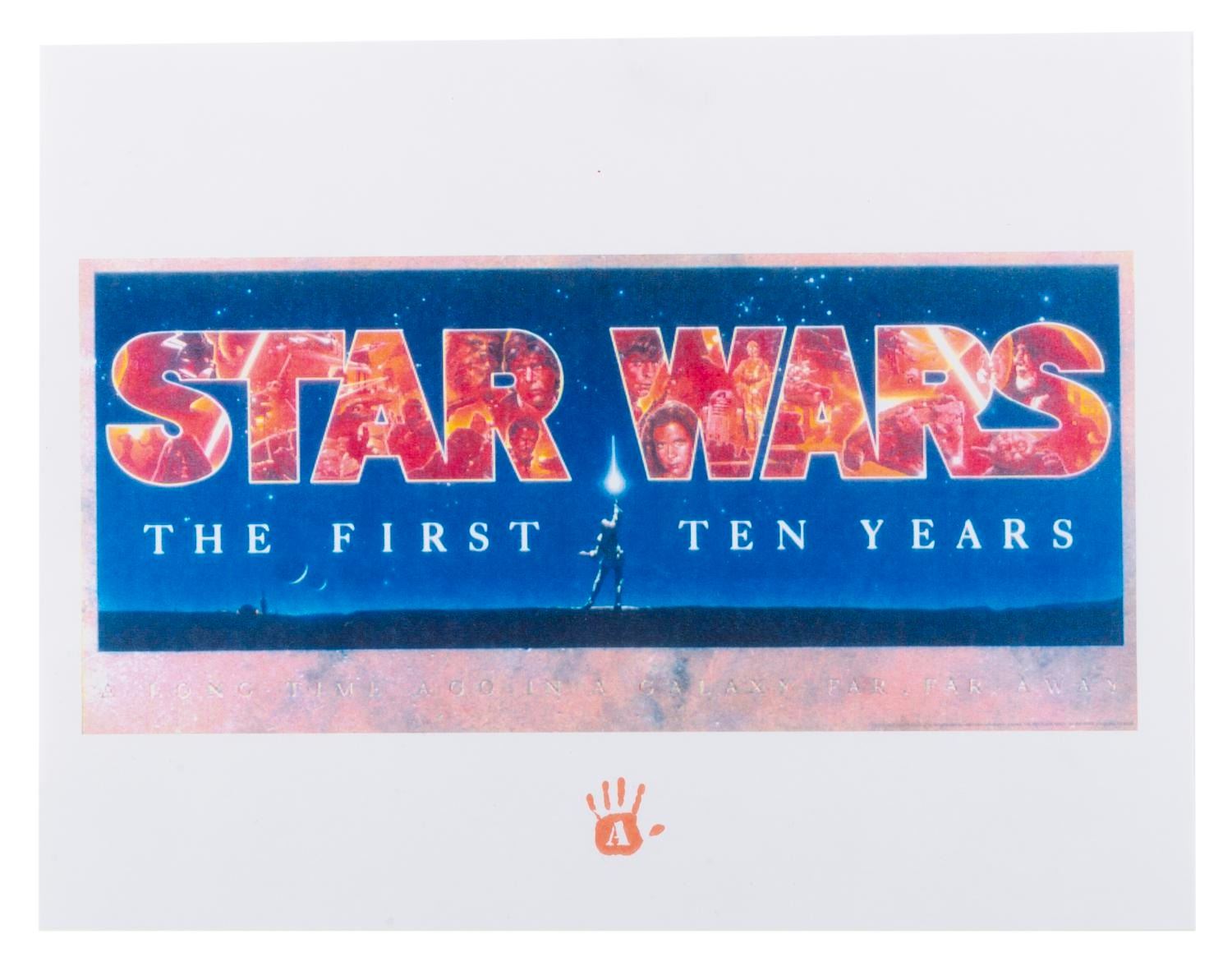 (Lucasfilm, 1977-2000s) A collection of Star Wars collectibles related to the first six films in the series. Included are the Marvel Special Edition oversized adaptation of the film issue 1, a fan club card, a flyer for the film’s pay-per-view debut in 1982, four color printouts of 1987 video release designs, seven uncut sheets of two sets of 9 Star Wars Galaxy trading cards from 1993, a 1995 video release announcement, and four senitypes each presenting one 35mm frame of the films. The collectibles are in good to very good condition, with some typical handling wear and discoloration from age to the comic.