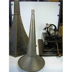 An Edison Gem Cylinder Phonograph No. 276455, with black and gilt line finish, Model C Reproducer, oak cased (damage to veneer) with rusty flared octagonal painted tin horn, another basic tin horn and twenty-four wax cylinders £100-150