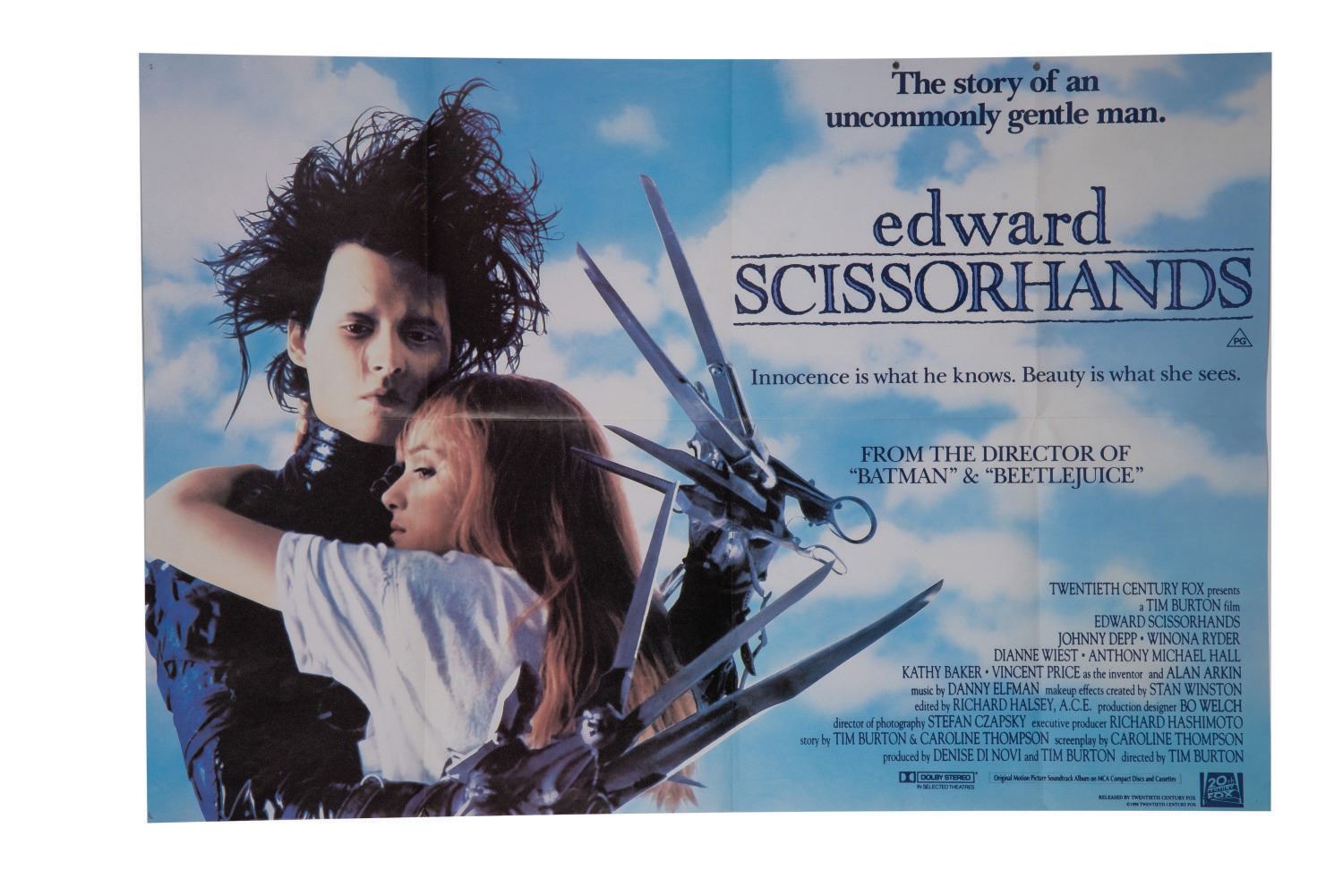 (20th Century Fox, 1990) An original release British Quad poster for Tim Burton's "Edward Scissorhands" starring Johnny Depp. Measuring 40"x27", the poster displays in very good condition, with the slightest wear to edges, and corners.