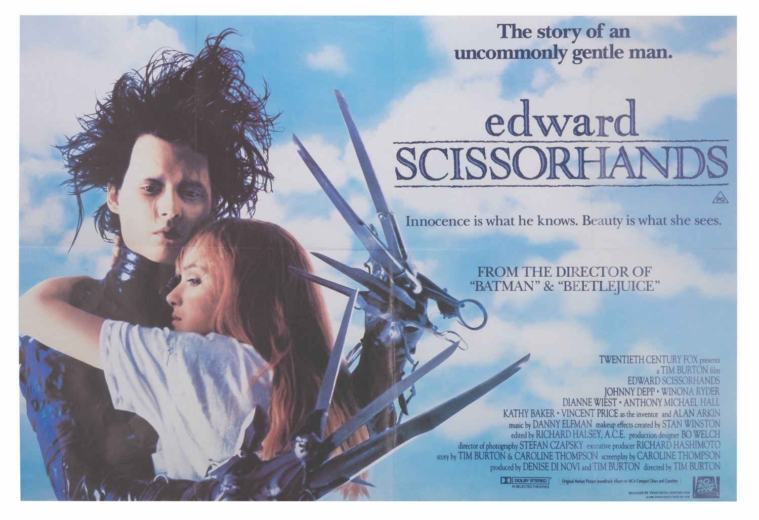 (20th Century Fox, 1990) An original British Quad poster for the theatrical release of Tim Burton's "Edward Scissorhands" starring Winona Ryder and Johnny Depp. Measuring 27" x 39.75", the poster displays in good condition with folds as issued, light edge wear and creases, and the title written on the reverse in pencil.