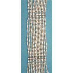 An Edwardian 12 row seed pearl bracelet with 2 gold and silver spacer bars set round cut diamonds, slide clasp £150-250