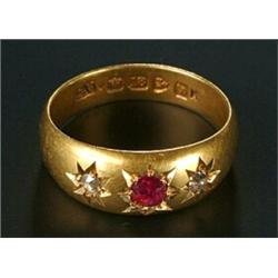 An Edwardian 18ct gold, ruby and diamond three stone gypsy ring, centred with a round mixed-cut ruby star-gypsy set between small old-cut diamonds, Chester 1907