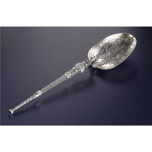 <B>An Edwardian Coronation Spoon</B></I><BR><BR>Elkington & Co., Ltd., Birmingham, England<BR>Circa 1901-1902<BR>Silver gilt<BR>Marks: (lion passant), (anchor), <I>E & Co.L p, b</B></I><BR>7 inches long<BR>1.46 Troy ounces<BR><BR>An anointing spoon to commemorate the Coronation of Edward VII. <B>Condition Report:</B> wear to gilding<BR><BR><b>Shipping:</b> Requires 3rd Party Shipping (<a target="_blank" href="http://www.heritageauctions.com/common/shipping.php">view shipping information</a>)