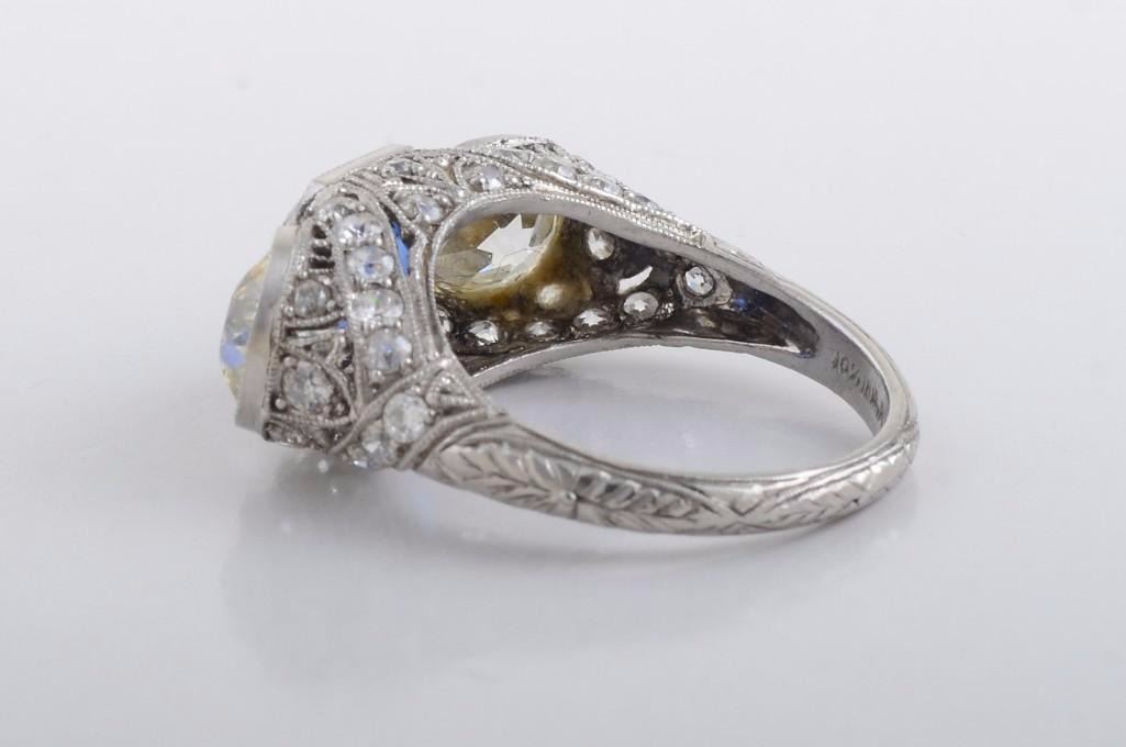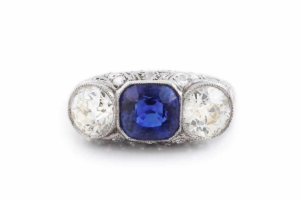 A wide three-stone ring with a center sapphire of excellent color weighing approximately 3.25 carats, flanked by two old European-cut diamonds weighing approximately 1.25 carats each. The shank is engraved with a sectional radiating design. Signed 10 1/4 IRID PLAT. Ring size approx 6 3/4. Total weight 6.9g