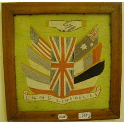 An Edwardian Woolwork Picture, Long Live Allies, 29.5 x 29 cm, and another, Tower Bridge, 25 x 26...