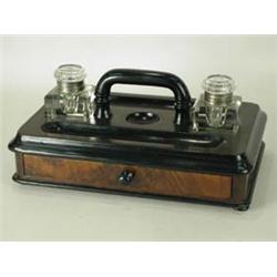 An Edwardian desk stand with a single drawer, and a pair of inkwells. 31cm Est.50/80
