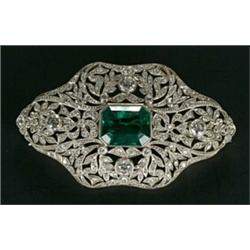 An Edwardian diamond and imitation emerald cartouche shaped brooch, designed as an openwork panel...