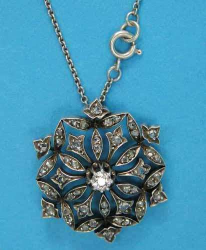 An Edwardian diamond set hexagonal openwork pendant, of foliate design in gold and silver mount £300-400