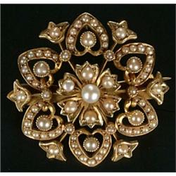 An Edwardian gold and half-pearl brooch centred with a flower-head within an open hexafoil border...