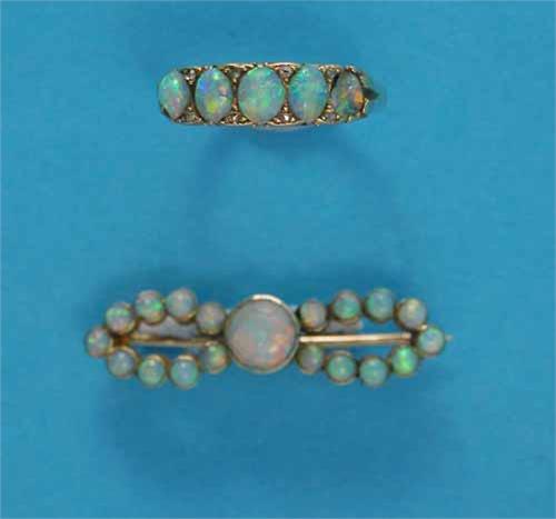 An Edwardian gold and opal bow brooch, and a Victorian 5-stone opal half hoop ring £100-150