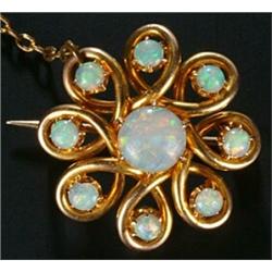 An Edwardian gold and opal brooch of spiral cluster design set with nine round white opal cabocho...