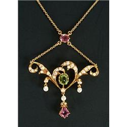 An Edwardian gold, half-pearl, peridot and pink tourmaline necklace, of openwork scroll design with seed pearl drops, in a fitted case marked St James' Edgbaston, 1908