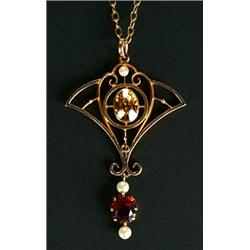 An Edwardian gold, zircon, garnet and pearl pendant of openwork double scroll design, stamped '9c...