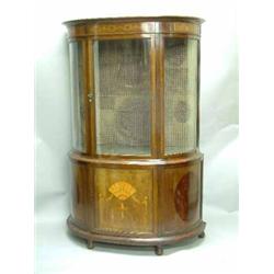 An Edwardian inlaid mahogany bow front display cabinet with single glazed door over panelled door...
