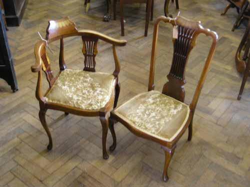 An Edwardian inlaid mahogany corner chair and a matching side chair....