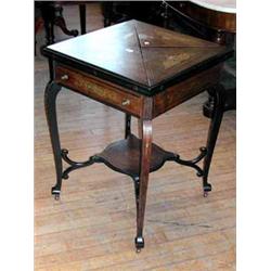 An Edwardian inlaid rosewood envelope top card table with frieze drawer above undertier