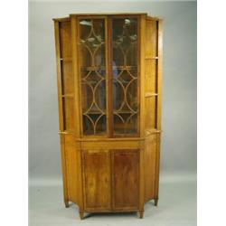 An Edwardian satinwood bookcase with two astragal glazed doors and shaped open shelves over two panelled doors and similarly shaped sides, with strung and crossbanded decoration, 193 high x 103cm wide