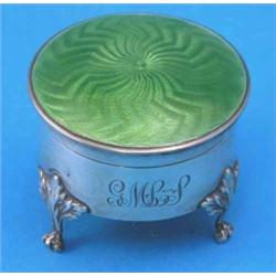 An Edwardian silver and green enamel trinket box, with engraved initials on scroll feet, Birmingham 1909, 1.75ins £50-80