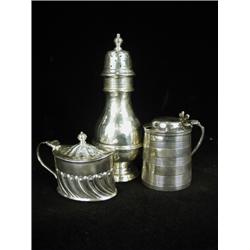 An Edwardian silver caster, London 1906, 18.5cm high, a half fluted mustard pot, Sheffield 1928, and a George III mustard pot and spoon (3) Est. 150/200