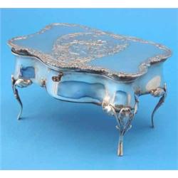 An Edwardian silver jewellery box modelled as an 18th century serpentine table, the hinged lid decorated with a panel of figures in gardens and supported on foliate cabriole legs, maker William Comyns & Sons, London 1905, 9.5ins £250-300