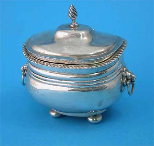 An Edwardian silver tea caddy, with gadrooned rim, twin lion mask loop handles and bun feet, Chester 1902, 4ins £100-150