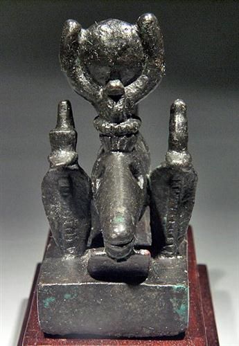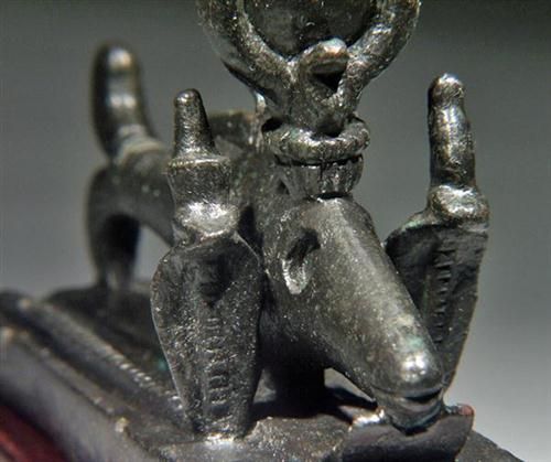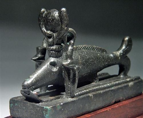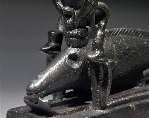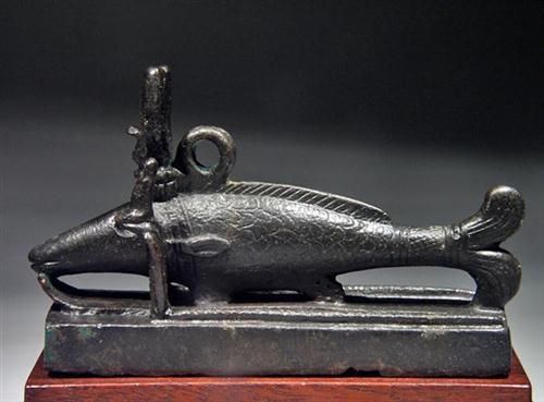 This is one of the most remarkable representations I have ever seen of the Oxyrhynchus fish. The animal is depicted in its typical form, with a distinctive elongated, downturned snout and equally distinctive bifurcated tail. The fish is wearing a headdress with frontal uraeus, surmounted by a solar disc between cow's horns, the crown of the goddess Hathor, to whom the fish was sacred. The animal has a suspension loop behind and a long, thin dorsal fin which terminates in the tail. Its deeply recessed eyes were possibly once inlaid. The fish is perched on a sled, attached by means of the lower fins, tail and curved end of the base where it joins the mouth. The whole statuette has a rectangular base with two tangs for attachment.There are two features that makes this representation so special. First there is a stunningly beautiful detailing of the animal's skin. The scales are very finely incised; it has been suggested that in view of this quality, the body of the fish may have been gilded. Equally well detailed are the collar, the gills and striations on the top and tail fins.And the other feature, something that I have never seen before on any of the Oxyrhynchos fishes I have ever come across, is the pair of long-bodied cobras accompanying the fish, one on either side. These snakes, the head erect and showing their fully puffed-up hood, both wear a crown: one the white crown of Upper Egypt and the other the red crown of Lower Egypt. This identifies them as Nekhbet and Wadjet, the protecting goddesses of the two parts of the country. Originally these were seen as a vulture and a snake, but because of their similar functions they could also be shown in similar shape, especially as cobras. Quite remarkable to encounter them here in the presence of the Oxyrhynchos fish!For an Oxyrhynchos fish with comparable detailing, however without the sled and without the accompanying cobras see Christie's London, sale 7017 of 26 - 27 October 2004, lot 135, which was auctioned for GBP 4,780 (then the equivalent of US$ 8,800).Background information: The ancient Upper Egyptian town Per-Medjed (modern el-Bahnasa) was the capital of the 19th Upper Egyptian nome. It was called Oxyrhynchos Polis by the Greeks, which means "Town of the sharp-snouted fish". This refers to a species of fish that lived in the Nile and that, according to mythology, ate the penis / phallus of Osiris after the dismemberment of this god by his brother Seth. It has been debated which species of fish it is, and there is some consensus that it is a species of mormyrus.According to Greek historian Plutarchos (1st-2nd century C.E.) the inhabitants of Oxyrhynchos and those of a neighbouring town called Kynopolis ("Town of the Dog") were engaged in hostilities because a person from the latter town ate a sacred fish, after which the inhabitants of Oxyrhynchos started catching and eating dogs; this resulted in a civil war which had to be ended by the Romans (De Iside et Osiride, 72).Dating: Late Period, 26th - 30th dynasties (ca. 664 - 342 B.C.). Size: length 12.3 cm, height 7.6 cm excluding tangs or 9 cm including tang; height including modern base 10.3 cm. There is a small area of restoration to the crown, mainly to the tips, and to the crown of one of the cobras. The statuette has been cleaned and treated for protection of the bronze, but the original encrustation has intentionally been left under the base. Mounted on a modern wooden base.Literature: