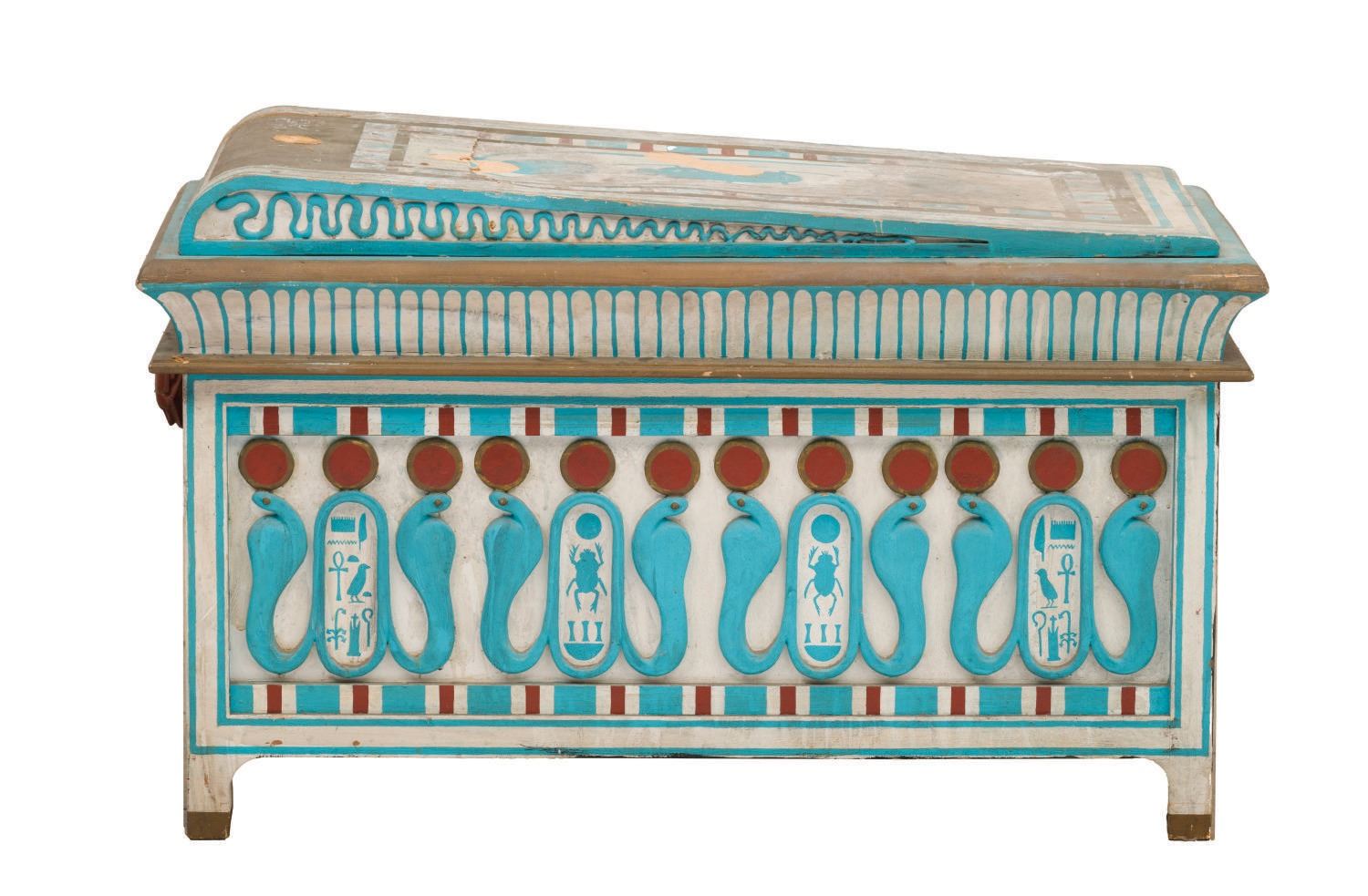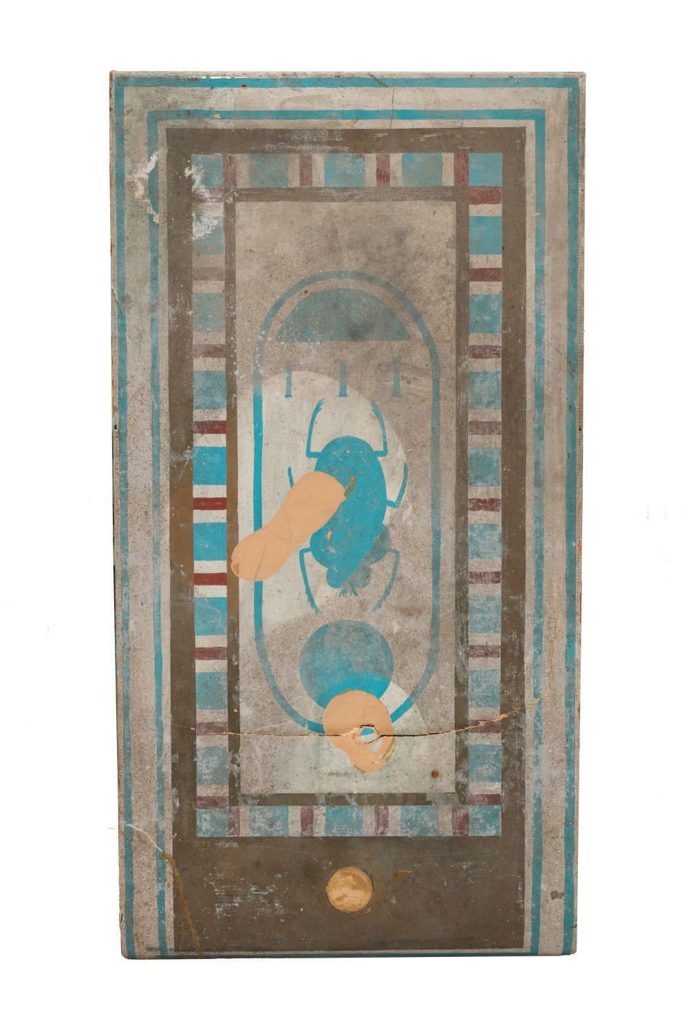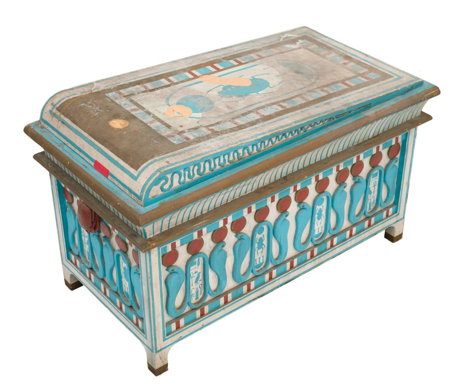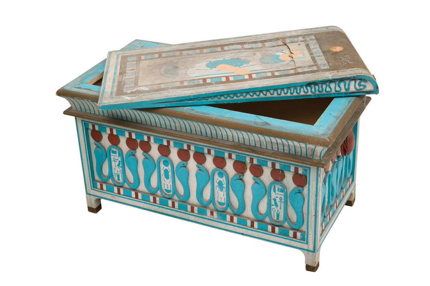 (Disney -MGM Studios, 1989) An Egyptian Chest prop from the Great Movie Ride at Disney-MGM Studios. This intricately painted chest was set decoration for the the Egyptian Temple scene. Notably one short end is painted plain black, clearly facing away from Guests view in the attraction. Measuring 38.5"x20.5"x24" high, the chest is in fair condition, with much wear to the top including a long split across the center of the lid towards one side.