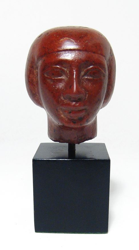 An Egyptian Red jasper head of a man, Late Period, c. 664 - 30 BC, with handsome features and wearing a short wig. The surfaces retain a good polish and the stone has a beautiful deep red mottled color. Head only measures 2 3/8 in x 2 ¼ in x 1 ¾ in (6 x 5.7 x 4.5 cm). Mounted. Ex London private collection.