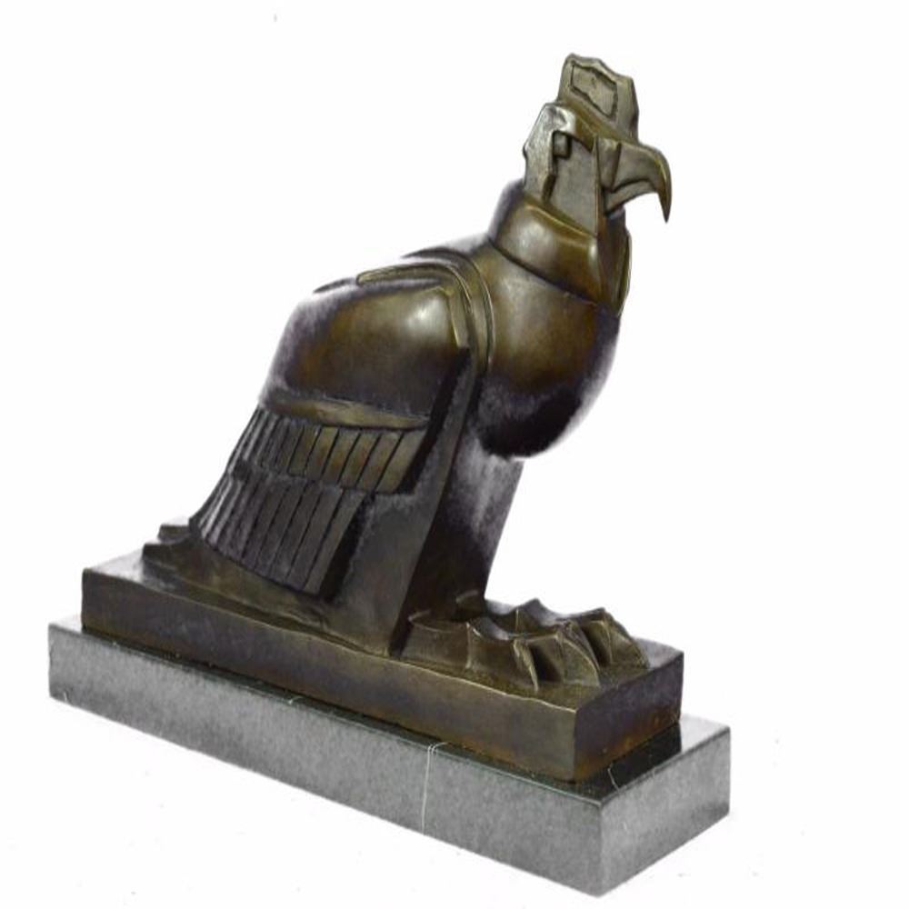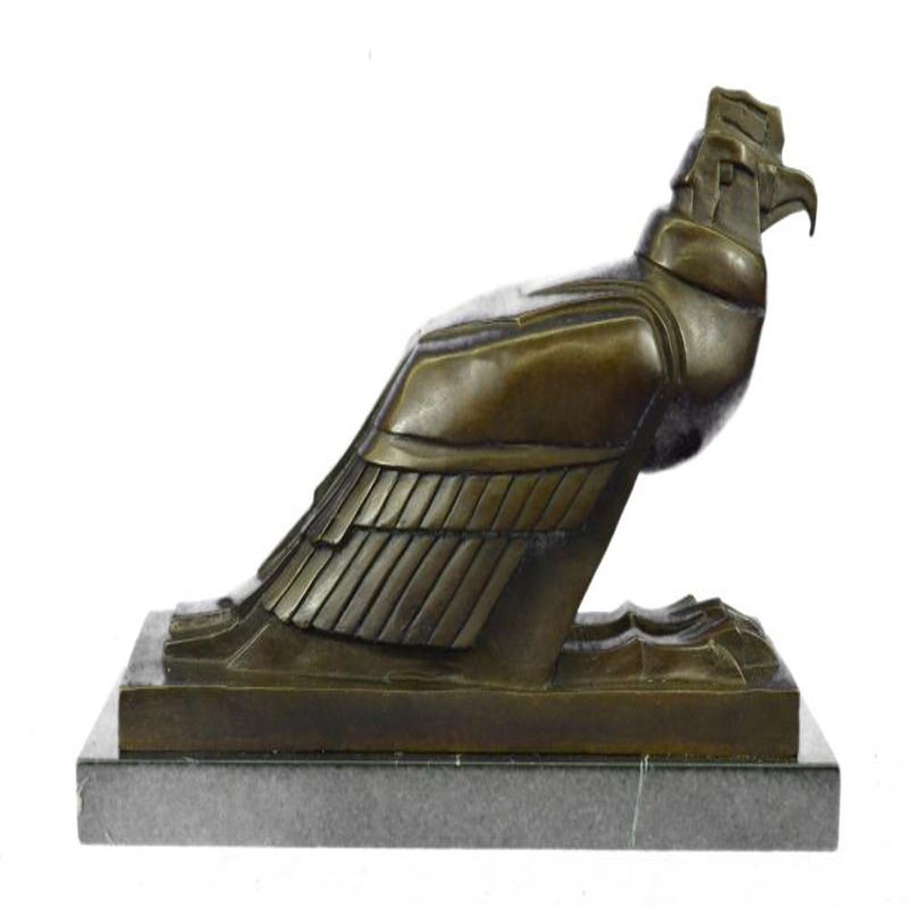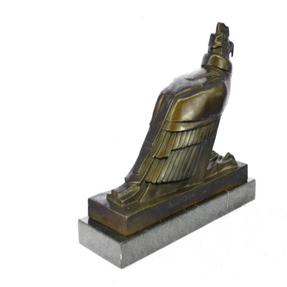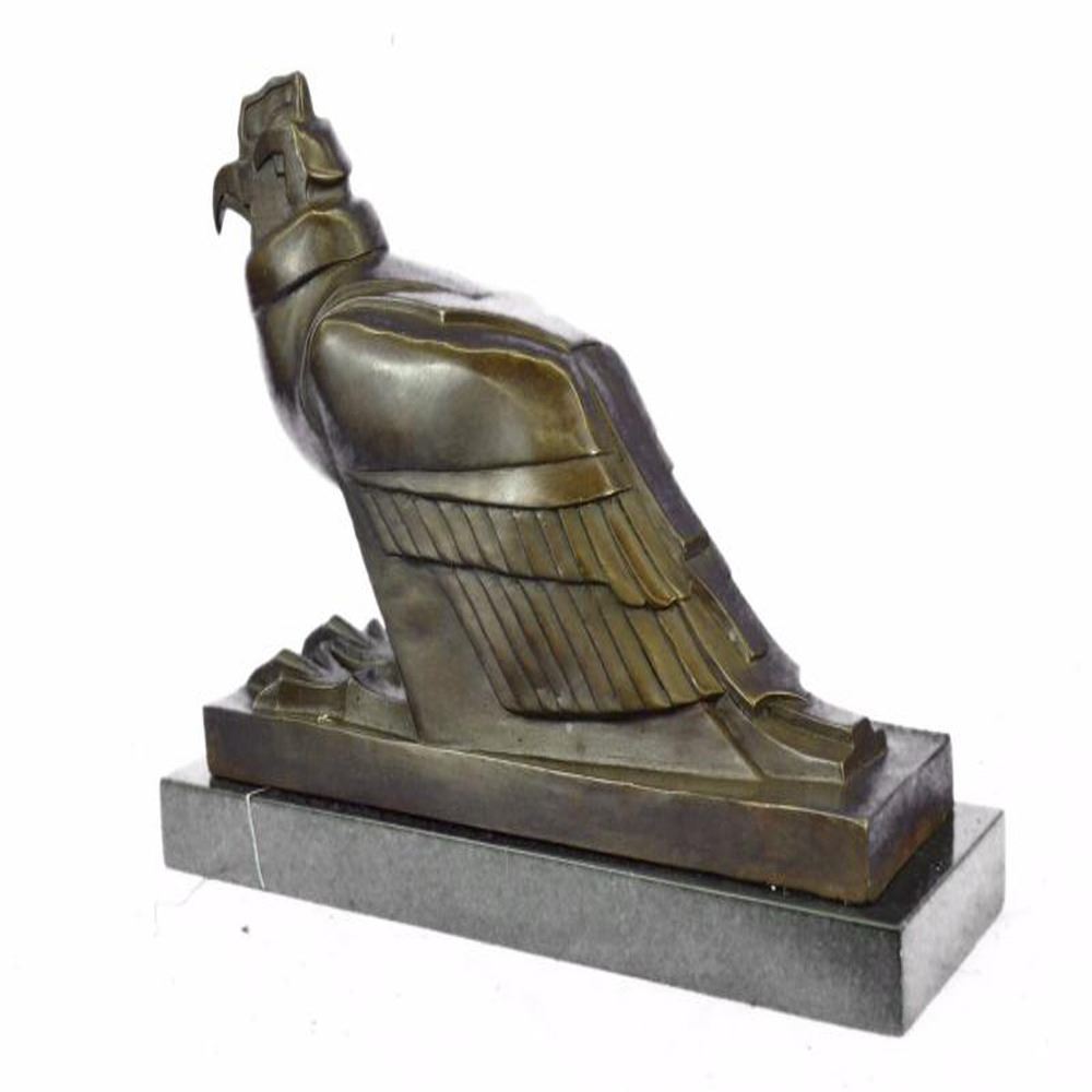 An Egyptian Style Figure of The Horus falcon Bronze Sculpture standing with wings folded over the tail, with large round eyes with raised rims, the eye markings and feathers finely engraved, remains of a square tenon on the crown for attachment of the headdress. This Sculpture was cast using the lost Wax Method and has a brown patina. Bronze Dimensions with Marble Base: Height 10 X Width 14 inches. Weight: 14 LBS.
