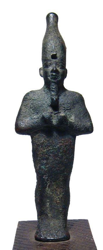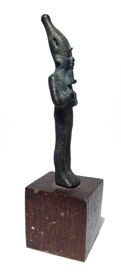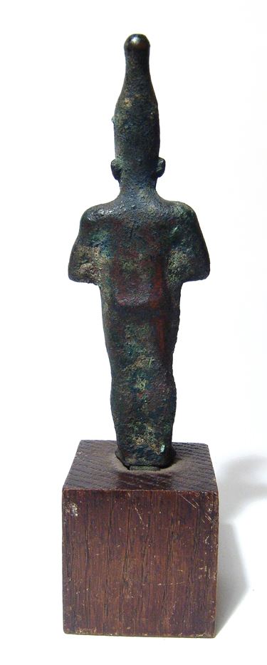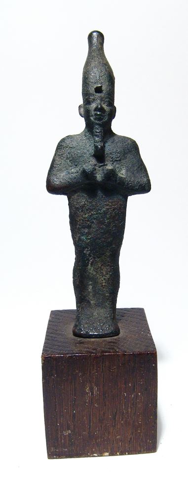 An Egyptian bronze standing figure of Osiris, Late Period, c. 664 - 332 BC, mummiform, wearing atef crown with uraeus and false beard, arms folded across chest, hands holding a crook and flail. The facial features are nicely rendered and the surfaces are lightly encrusted with a dark brown - green patina. Feathers at sides of crown (probably originally silver) now lost, their attachment points still visible. H: 5 1/5 in (13.2cm). Mounted on a custom wood base. Ex Harmer Rooke Galleries purchased in the 1980's.