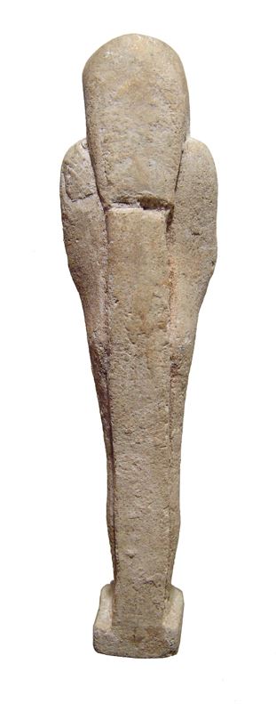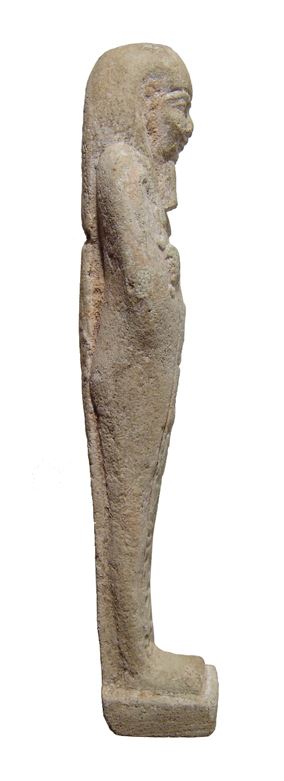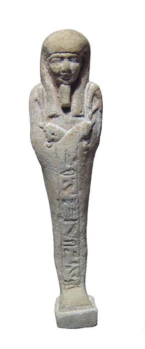 An Egyptian faience ushabti, Late Period, c. 664 - 30 BC, mummiform, wearing tripartite wig and false beard, arms folded across chest, hands holding a pick and hoe, bag over left shoulder, vertical column of text down front, plinth on back. H: 4 1/8 in (10.6 cm). Intact, remains of pale blue-green glaze. Ex early 20th Century British collection.