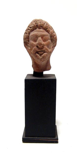 An Egyptian terracotta head of a priest, Roman Period, c. 1st - 3rd Century AD, wearing leopard-skin hood, beard and mustache. Head without stand - 1 ¾ in (4.4 cm). Custom stand. Ex Philadelphia private collection.