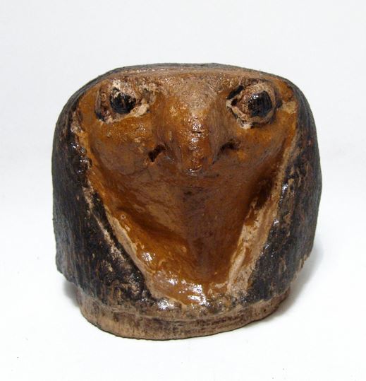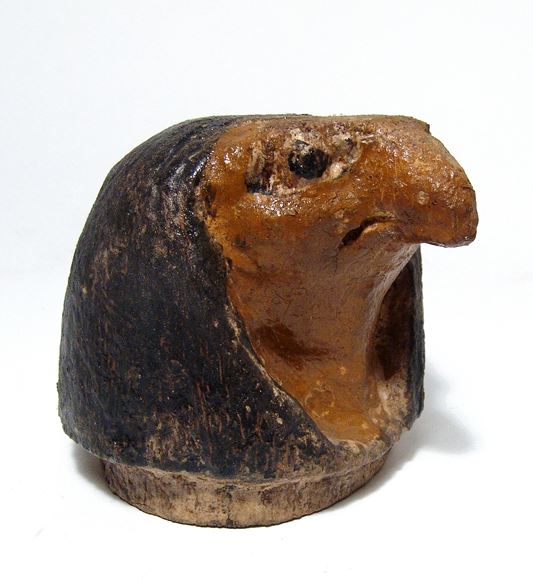 An Egyptian wood lid for a canopic jar, Late Period, c. 664 - 30 BC, representing falcon-headed Qebehsenuef, the god of protection and of the west and who protected the liver of the mummy. The pigment is nicely preserved with old collection numbers on the base. 3 ½ in x 4 ¼ in (8.9 x 10.7 cm). Ex Ligabue Collection, Venice.