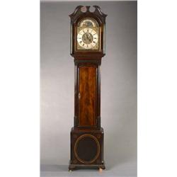 An Eight Day Long Case Clock, by Helm, Ormskirk], the 13inch silvered and brass dial with engraved and matted centre, seconds and date, a rolling moon in the arch, in a mahogany case of Liverpool style with blind fretting cluster columns and inlaid ovals and circles, the hood with similar columns and scroll pediment with nicely carved blind fretting, ogee bracket feet, circa 1775, {242cm} £3500-4500