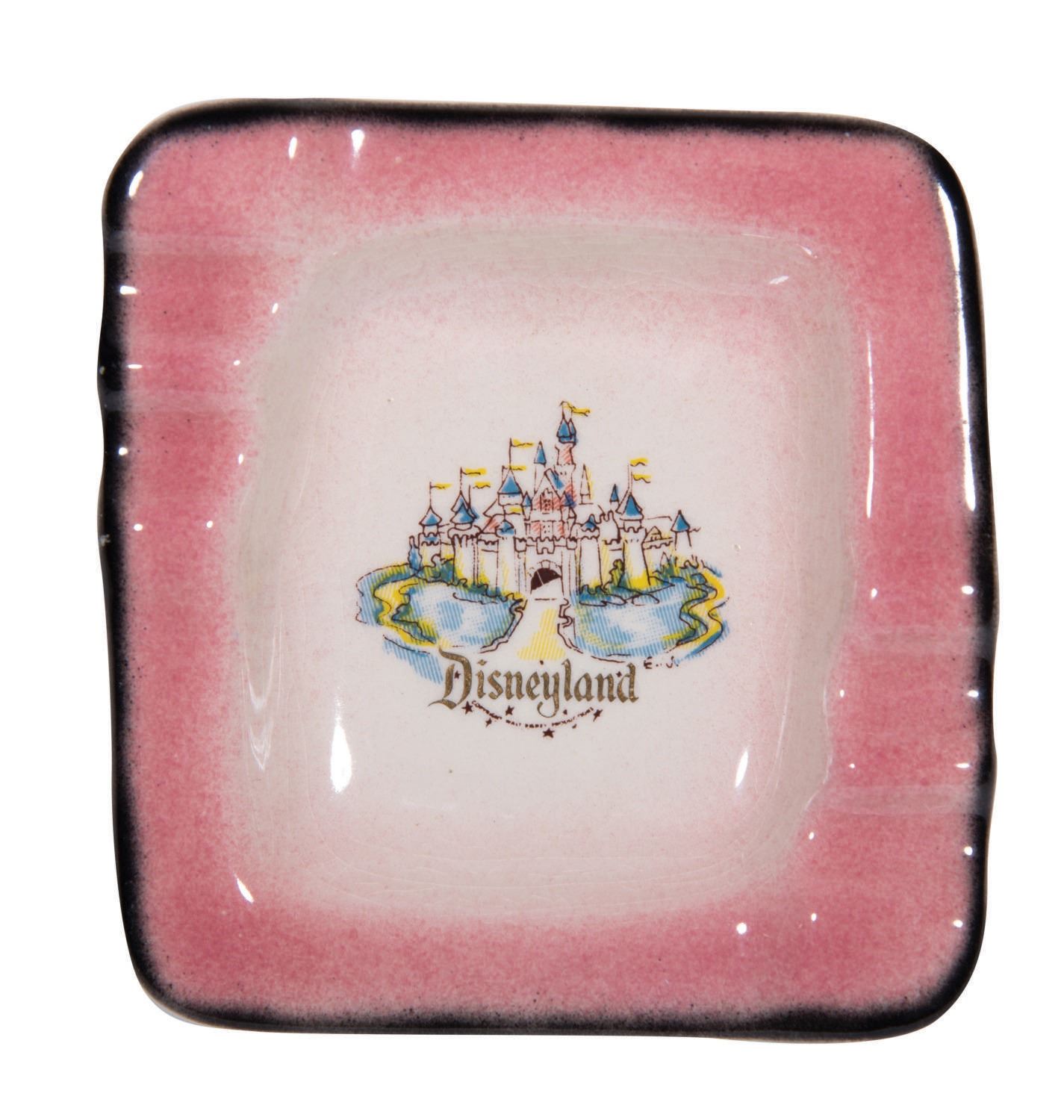 (Disneyland, 1955) A small souvenir ashtray depicting the iconic Sleeping Beauty Castle. The four-toned vignette is centered within a glazed ceramic ashtray and was made exclusively for Disneyland by local Monterey artists at Eleanore Welborn Art Productions. Measuring 3.75"x4"x1", the souvenir of Disneyland displays in very good condition with minor crazing throughout.