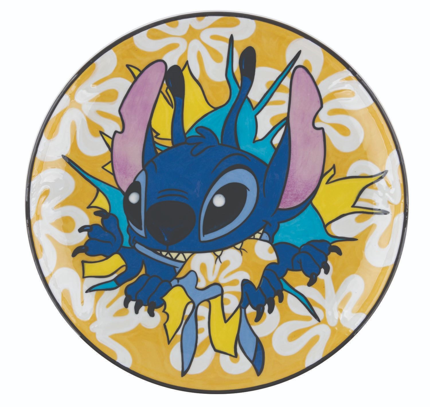 (Disney, 2004) A rare Stitch charger plate signed by artist Elisabete Gomes. The decorative plate is titled "Aloha!" and hand-numbered 17/25. Measuring 14" in diameter, the charger plate is in very good condition with light paint loss.