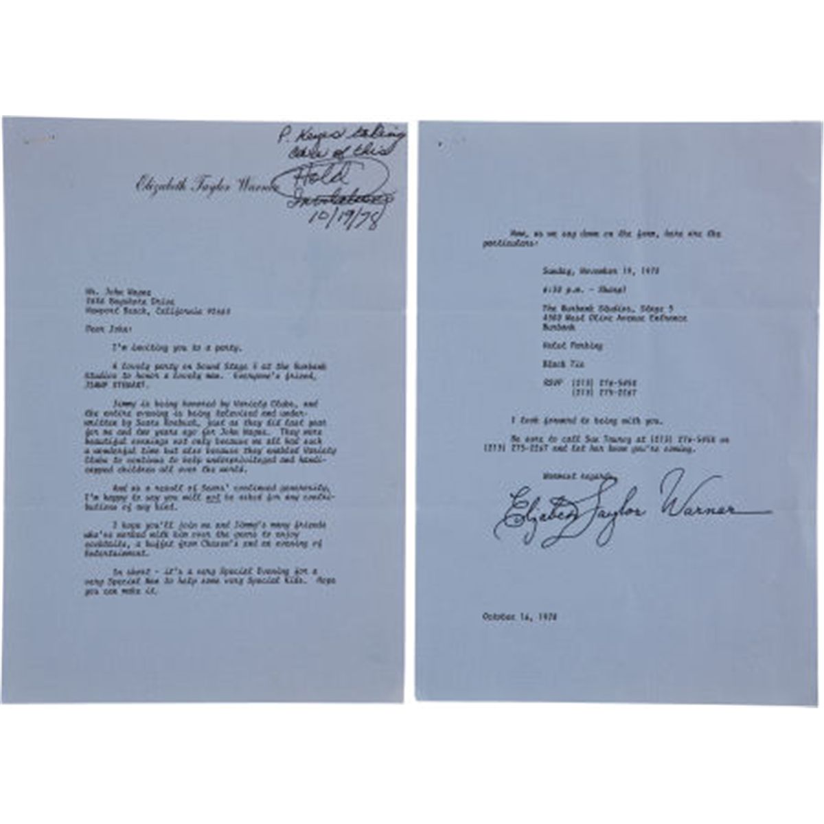 An Elizabeth Taylor Signed Form Letter, 1978. Typed on two pages of personalized stationery, dated "October 16, 1978," regarding a televised event honoring Jimmy Stewart, signed on the second page in black felt tip ink "Elizabeth Taylor Warner;" with Wayne's own black felt-tip ink annotations on the first page in the upper right corner; with original transmittal envelope.10 1/2" x 7"