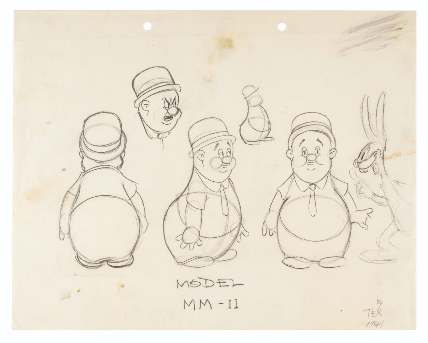 (Schlesinger, 1941) An original hand-drawn model sheet of Elmer Fudd from the Merrie Melodies short “Wabbit Twouble,” signed and dated by Tex Avery. This redesign of Elmer gives the character a fatter, rounder look compared to his previous appearances, in an attempt to model him after his voice actor, Arthur Q. Bryan. Measuring 9.5” x 12”, the graphite sheet is in good condition with edge wear, creases, smudges, finger prints, a horizontal fold running the width of the sheet 1.75” up from the bottom, and light discoloration from age.