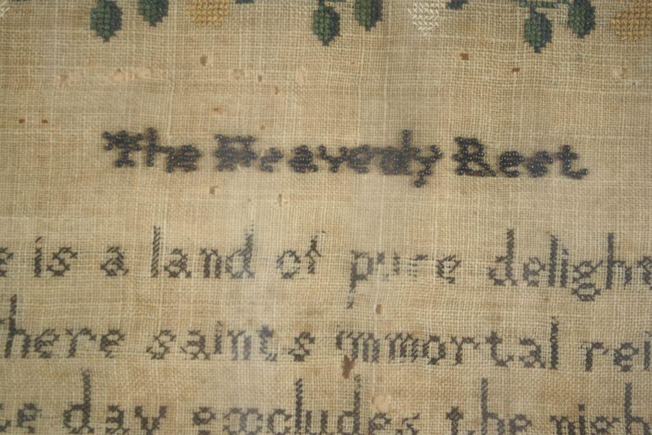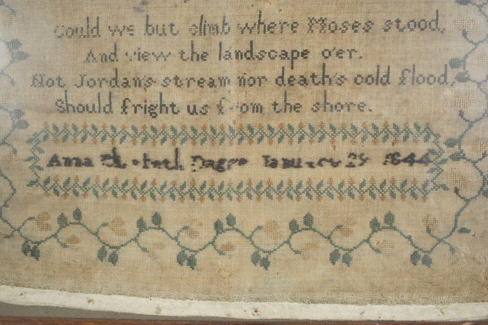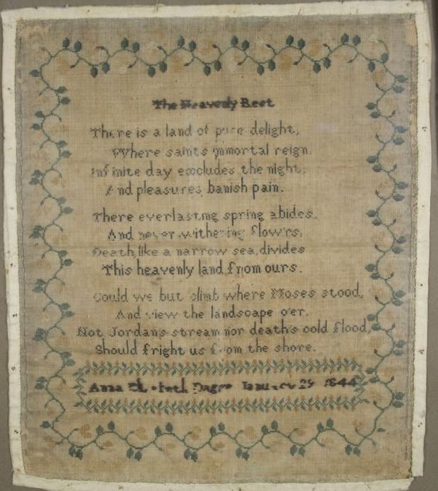An Embroidered and Beaded Sampler, dated 1844, "The Heavenly Rest" poem,