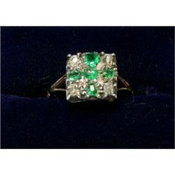 An Emerald and diamond ring with square setting containing five emeralds in a cross within a surround of rose cut diamonds £300-350